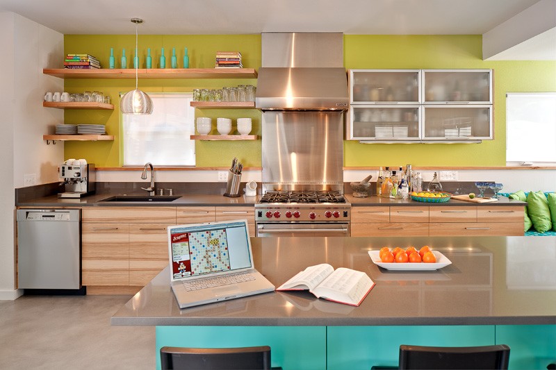 Design interior cu turcoaz si olivIn fundal: muza proiectului, ceasul de perete Sunburst al lui George Nelson. Design interior cu turcoaz si olivPentru living, designerul a ales sa foloseasca un fundal gri pe care sa juxtapuna din loc in loc pete de culoare. De data aceasta, a ales portocaliul care, ca si in cazul culorilor folosite la bucatarie, se completeaza de minune cu lemnul natur al mobilei.